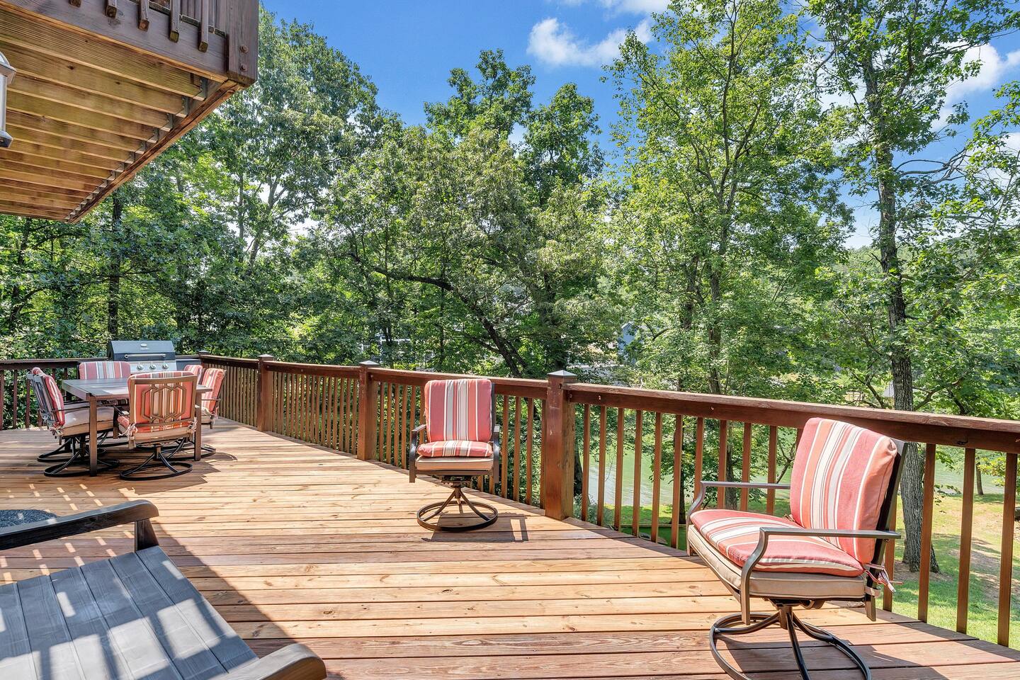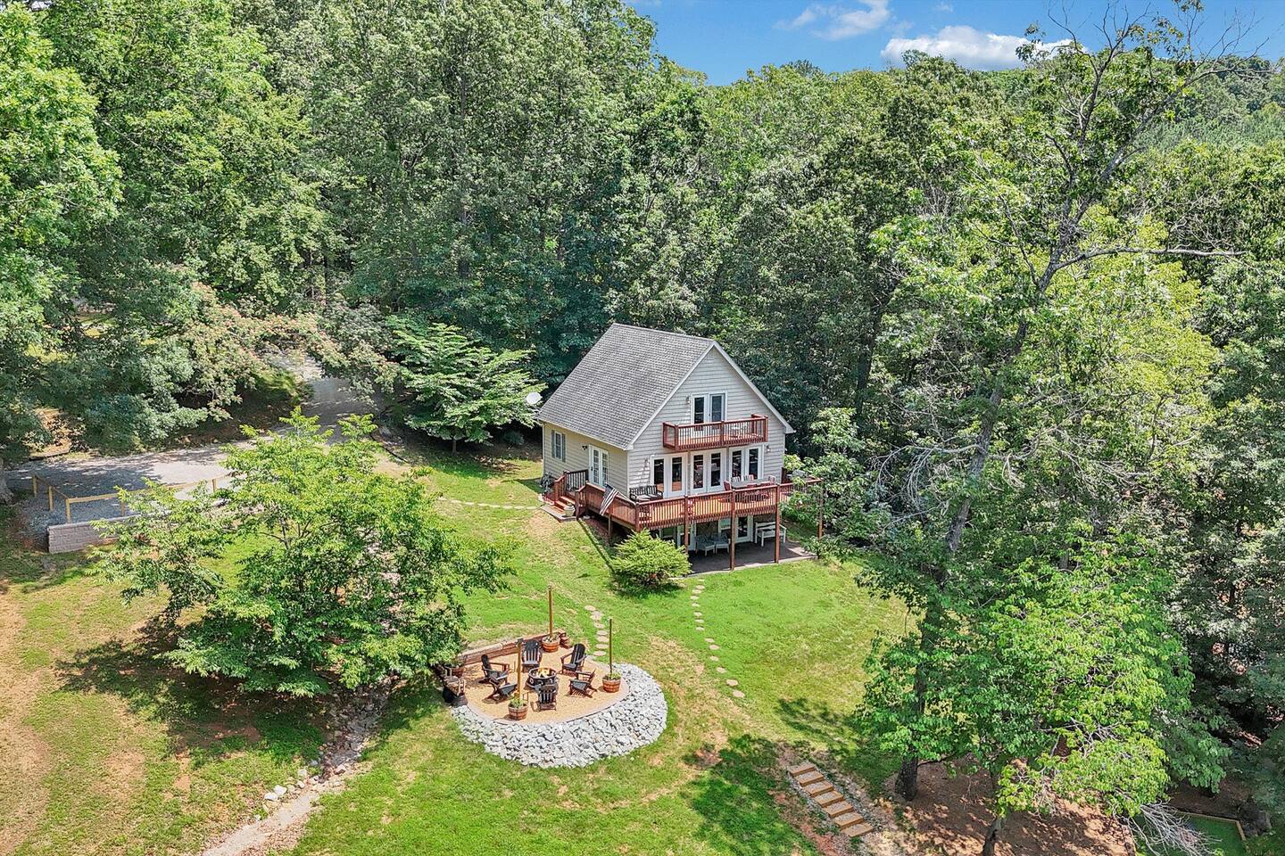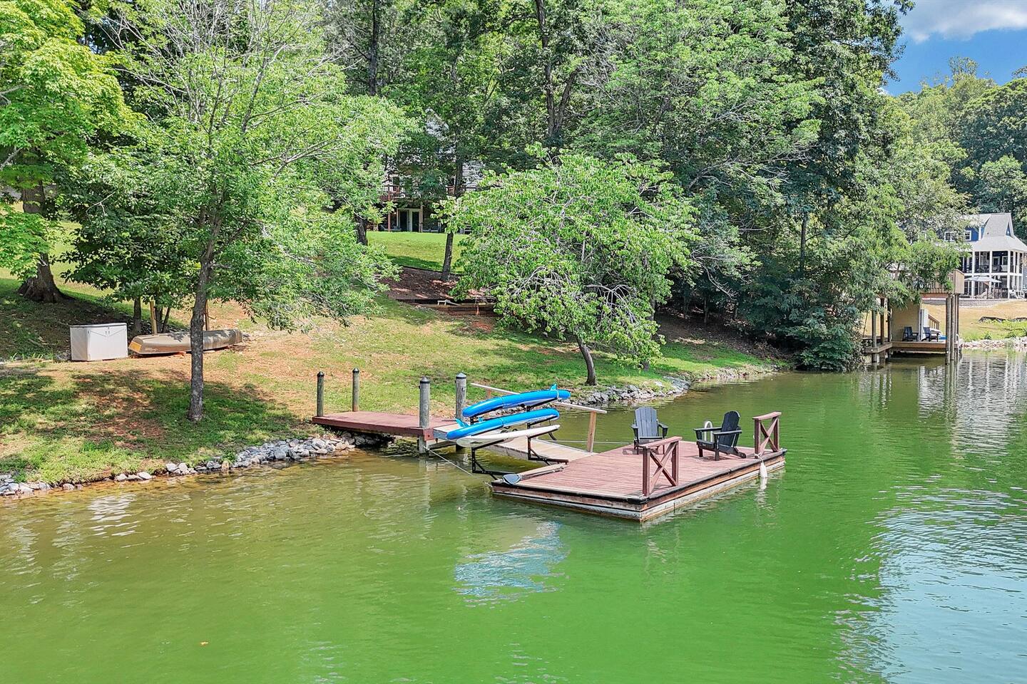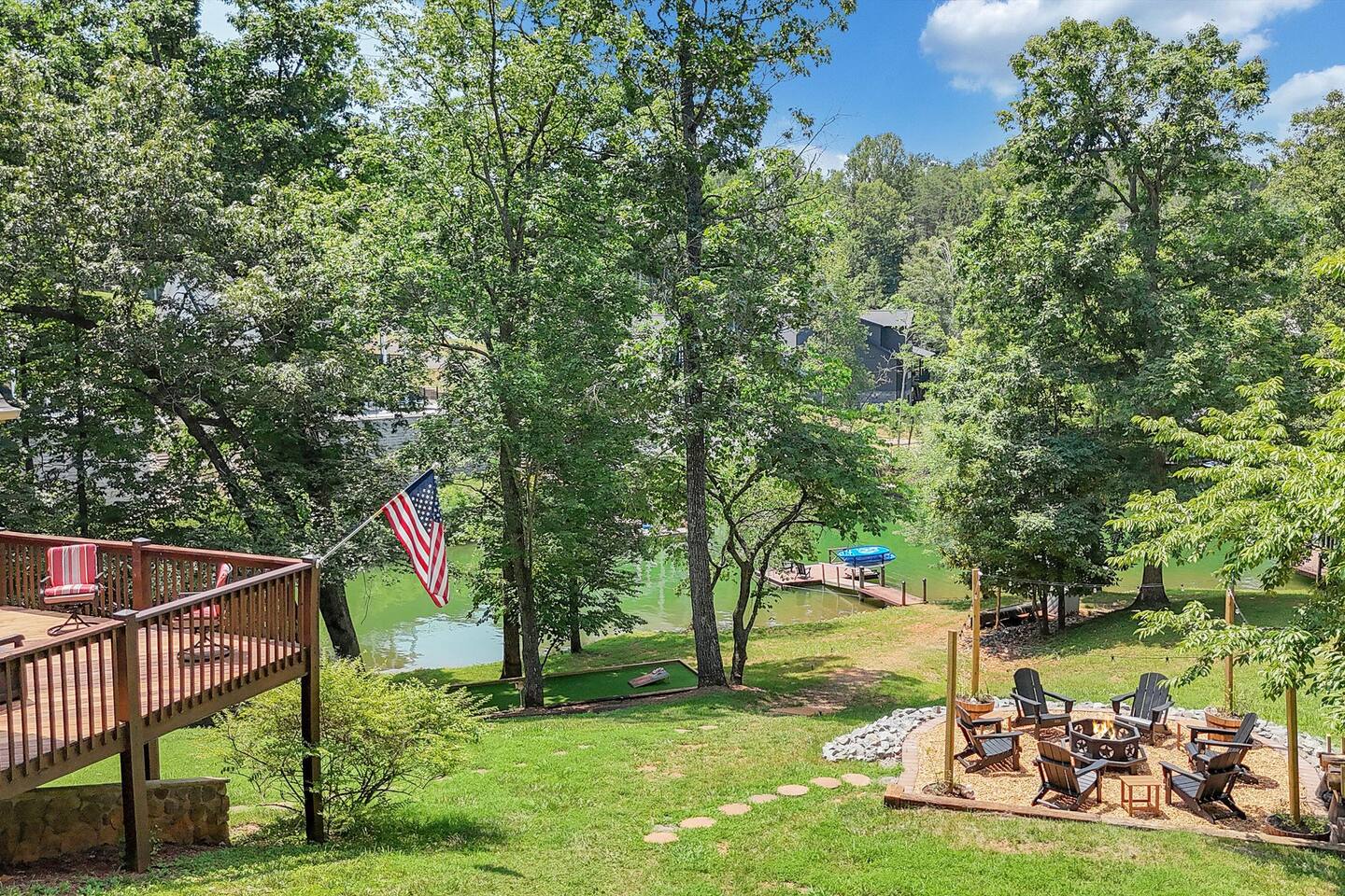 Water views from all 3 levels! The main level includes the living room, dining room, and fully equipped kitchen. A large wrap around deck with an outdoor dining table and gas grill is located off the main level. There is one bedroom with a queen bed and a separate full bath in the hallway next to the kitchen. The other two bedrooms are located upstairs. One bedroom has a king bed, desk and chair, and small private balcony overlooking the lake. The other bedroom has a queen bed. Both upstairs bedrooms share a full bathroom with a double vanity, shower, and garden tub. The basement has another living area with a pullout queen sleeper sofa, small dining table, and ping pong table. Board games and a gaming console are located downstairs. There is also a half bath downstairs. The washer and dryer are located downstairs in an unfinished room. A covered patio is located off the basement as well that leads to a grassy area. Outside there is a bonfire pit with 6 Adirondack chairs and market lighting. A designated astroturf lawn game area is nestled among trees to play cornhole, kan jam, bocce ball and other fun games in the shade. There are standup paddleboards on the private dock with 2 Adironadack chairs and a swim ladder for use. A canoe, floating water pad, and life jackets are also available for use.